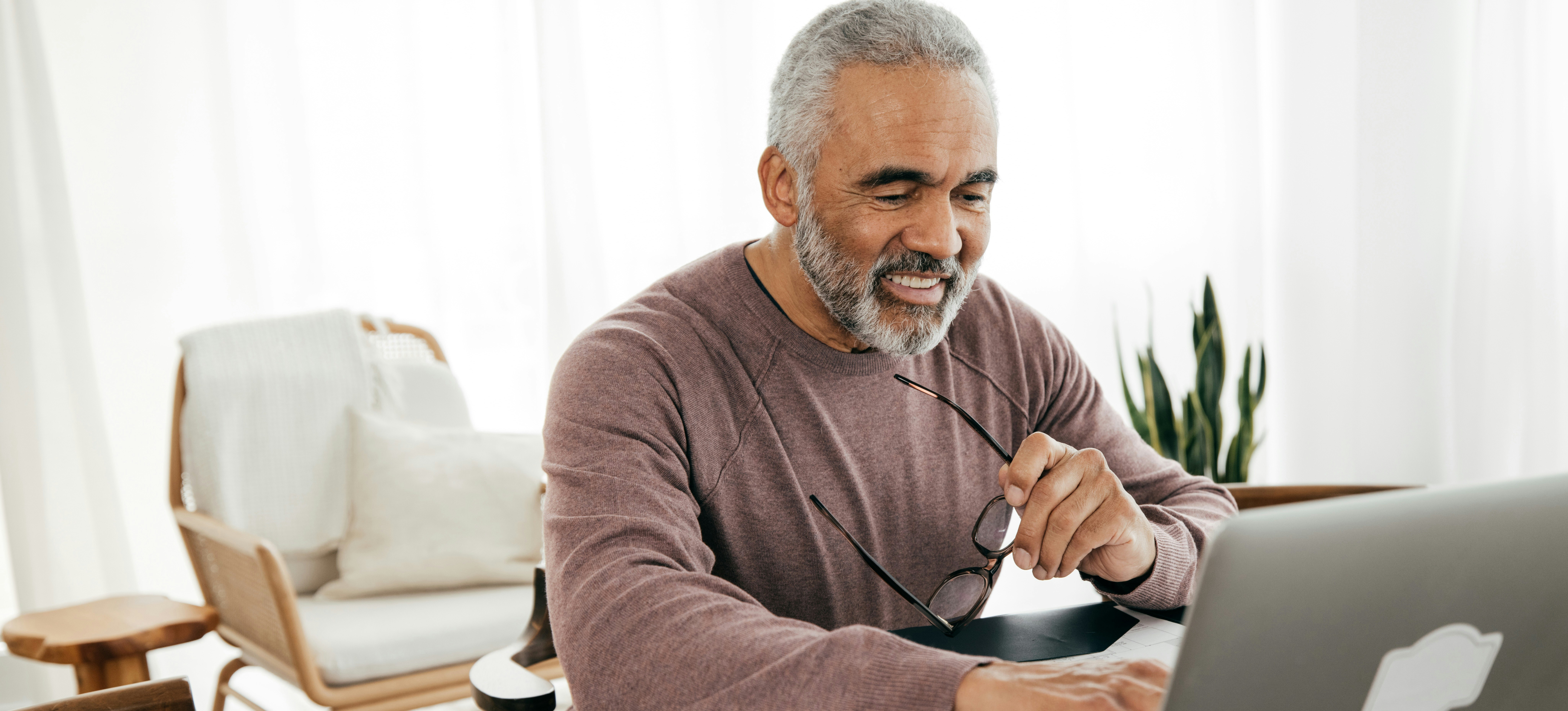 [Featured Image] A man sits at a laptop in his home office and researches what his retirement age is.