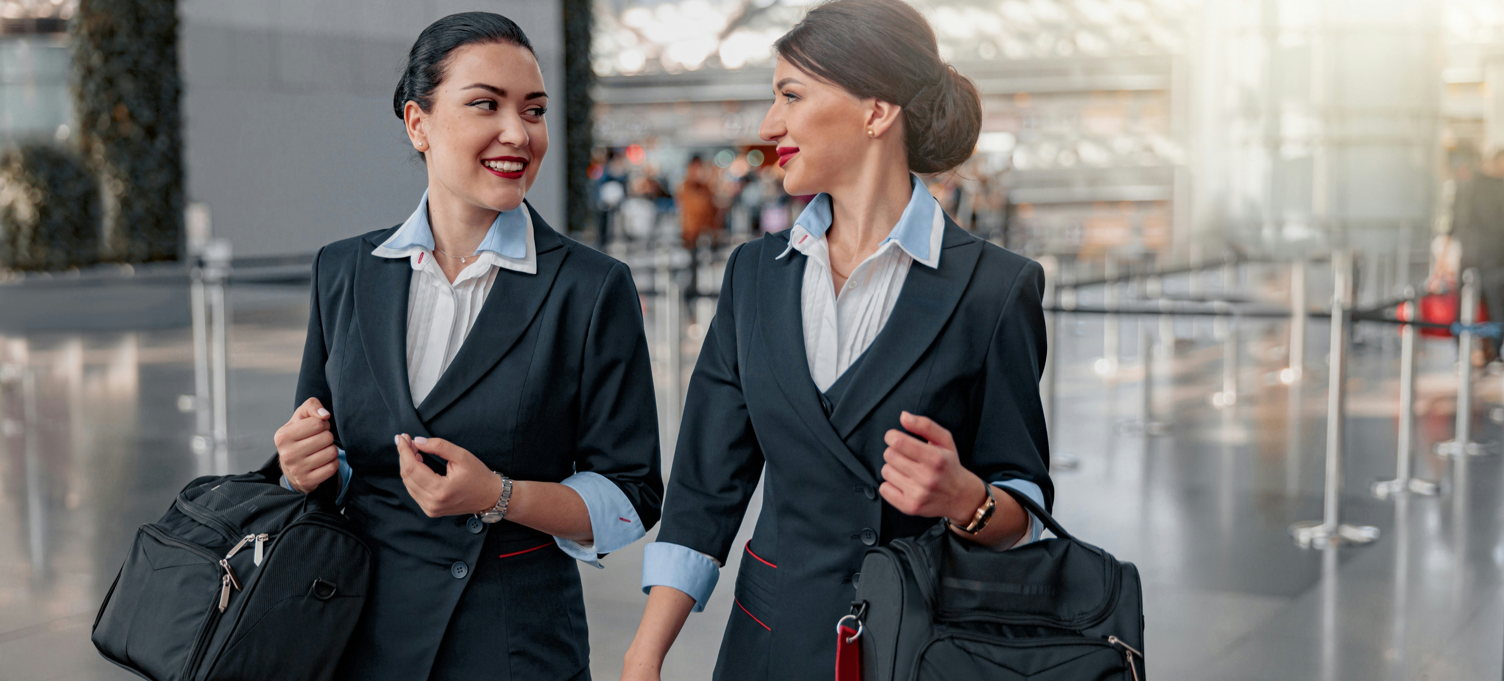 [Featured Image] Two flight attendants carry their bags and talk while walking through an airport.