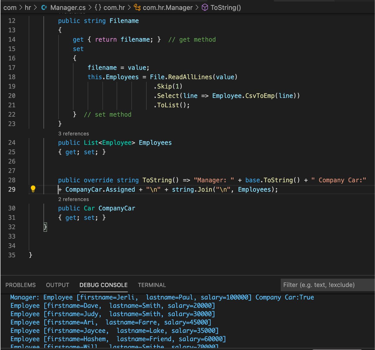 Combine the Manager, Car and Employee into one C# application to demonstrate C# Class Re-use.