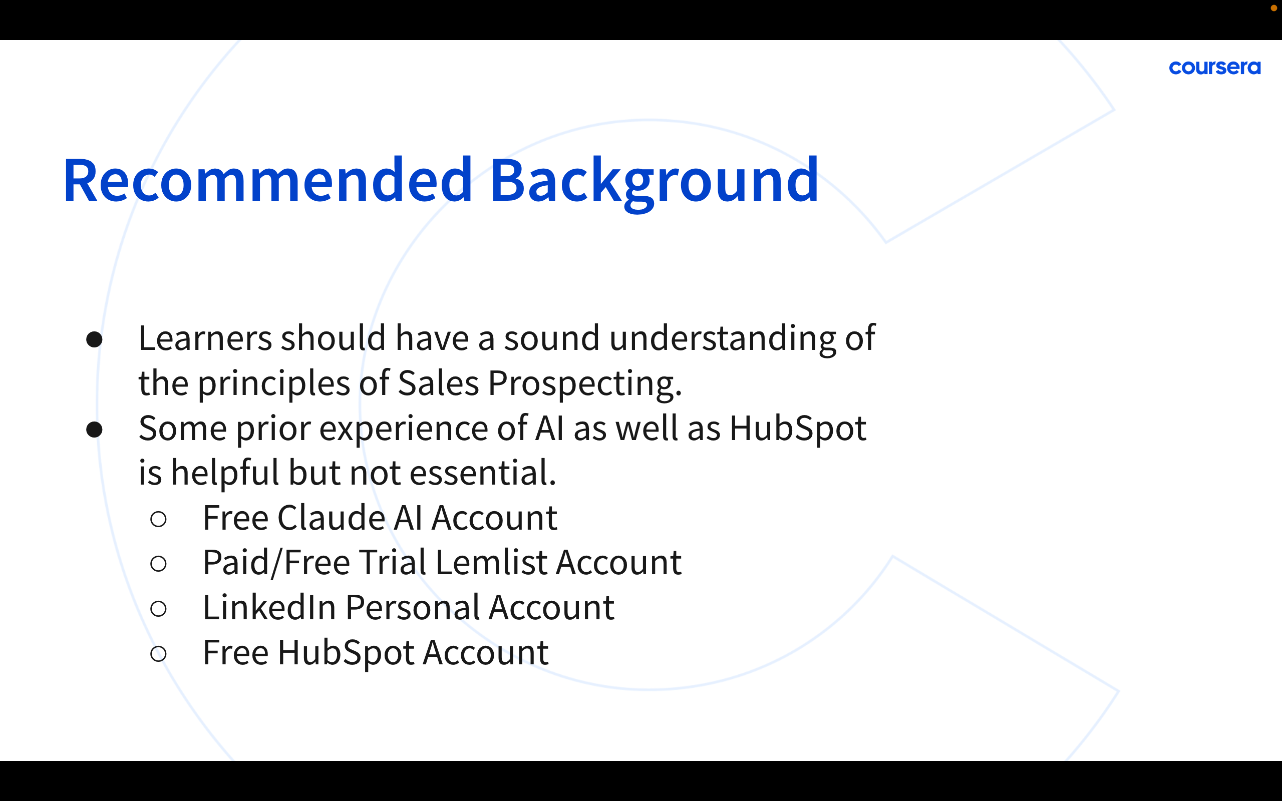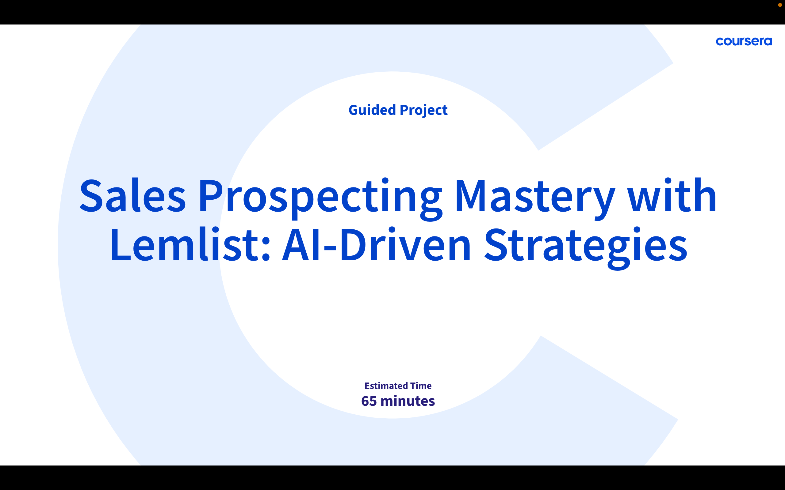 In this intermediate-level guided project, you will master the art of AI-driven prospecting using Lemlist. We will do this by setting up and leveraging Lemlist for automated email and LinkedIn outreach, to create a sales pipeline and enhance your prospecting efficiency. You will learn how to integrate Lemlist’s AI capabilities to personalise and optimise your campaigns. Additionally, you’ll explore best practices for creating and managing automated sales funnels in Hubspot, ensuring a seamless transition from lead generation to customer conversion. By the end of this project, you will have the skills to drive more effective and automated prospecting campaigns. Learners will need a sound understanding of the principles of Sales Prospecting. Some prior experience of AI and HubSpot would be advantageous. Learners will also need to set up accounts in Claude AI, Lemlist, HubSpot and LinkedIn.