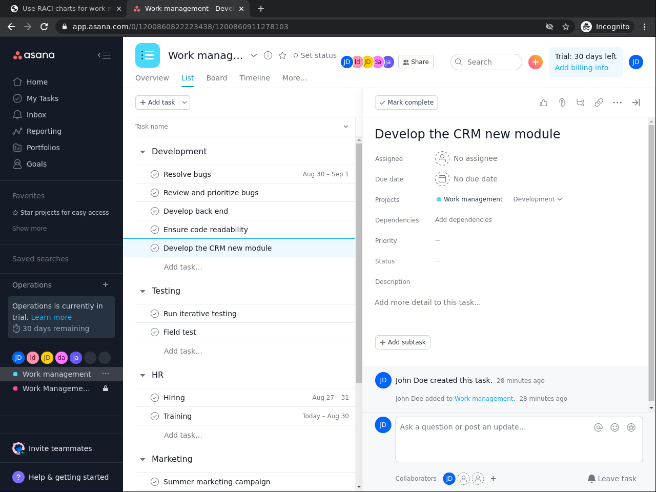 Manage tasks, subtasks and assignees to implement RACI charts in Asana